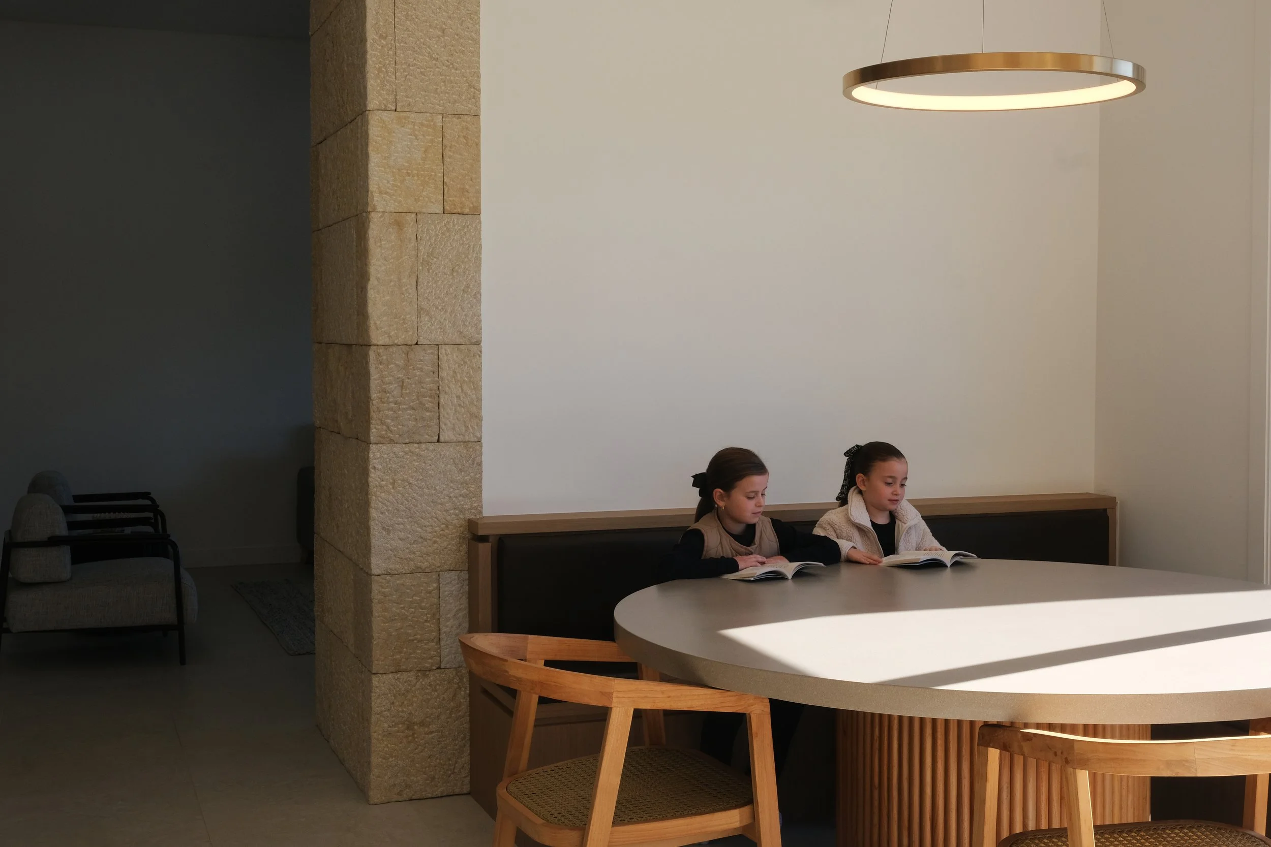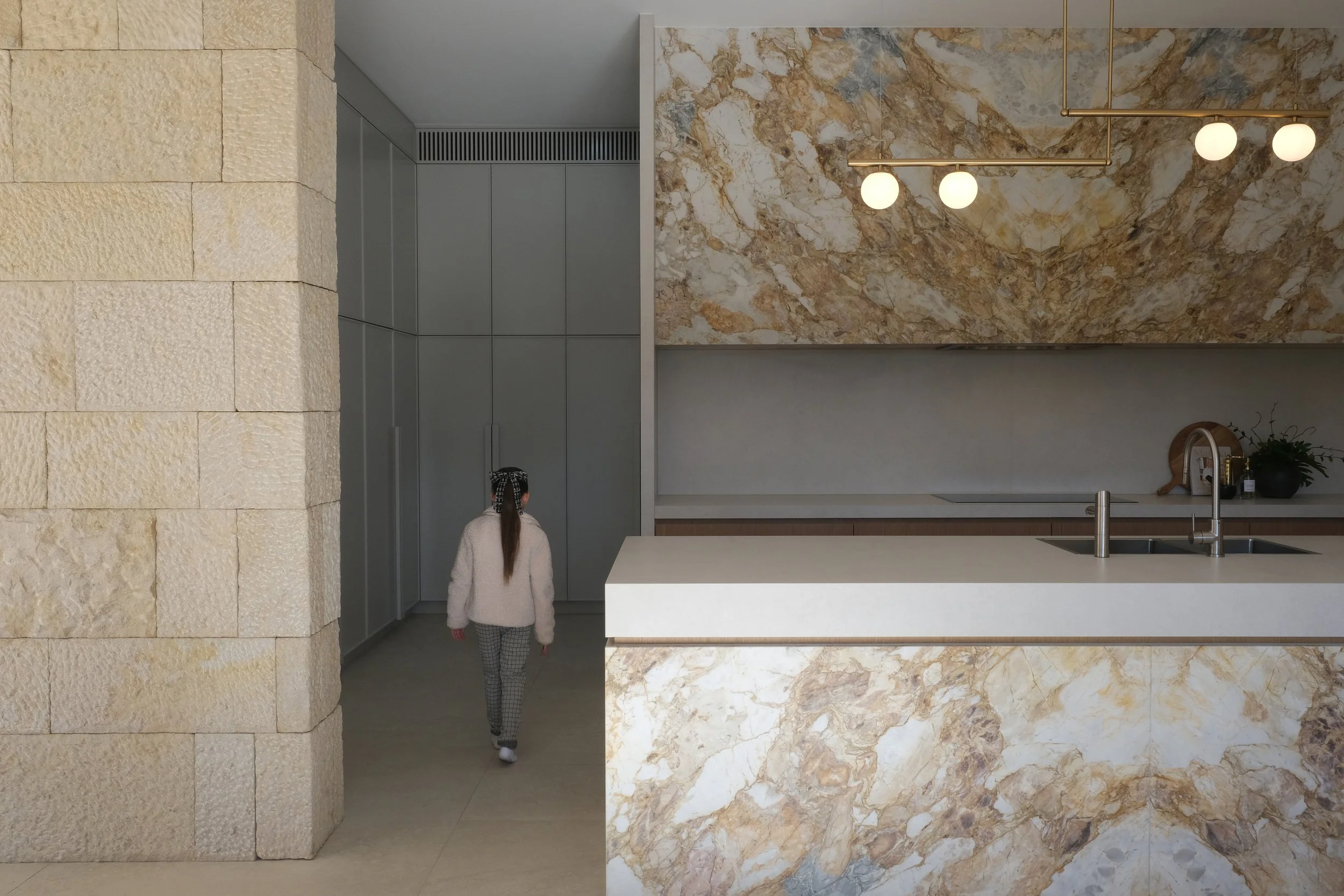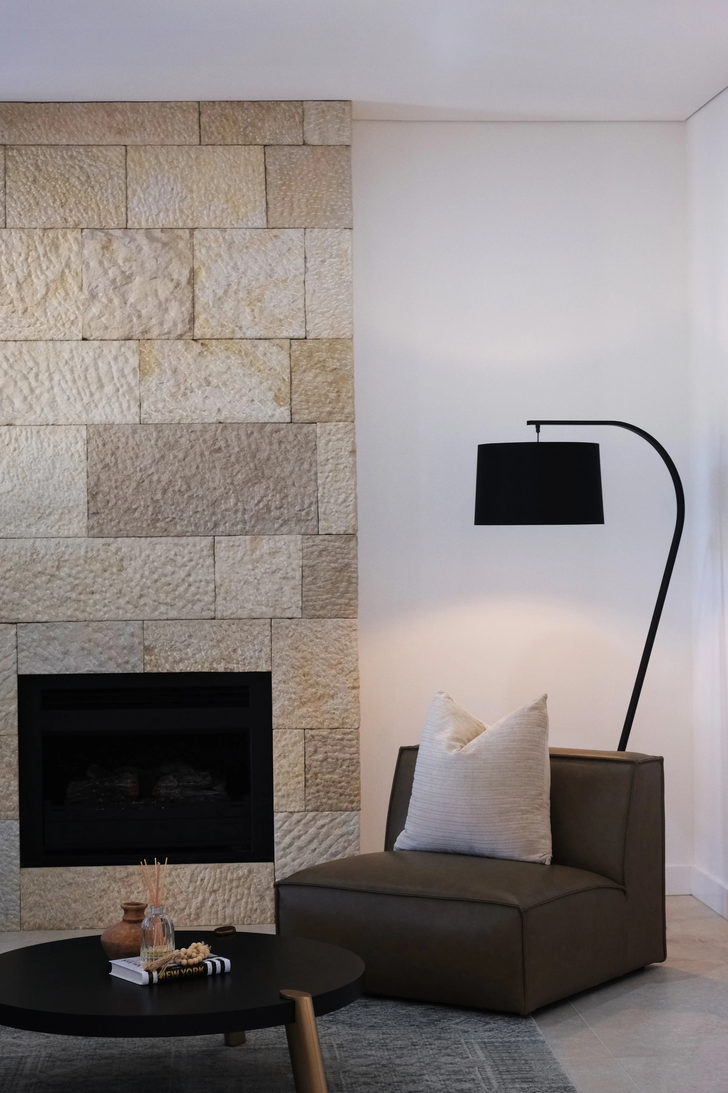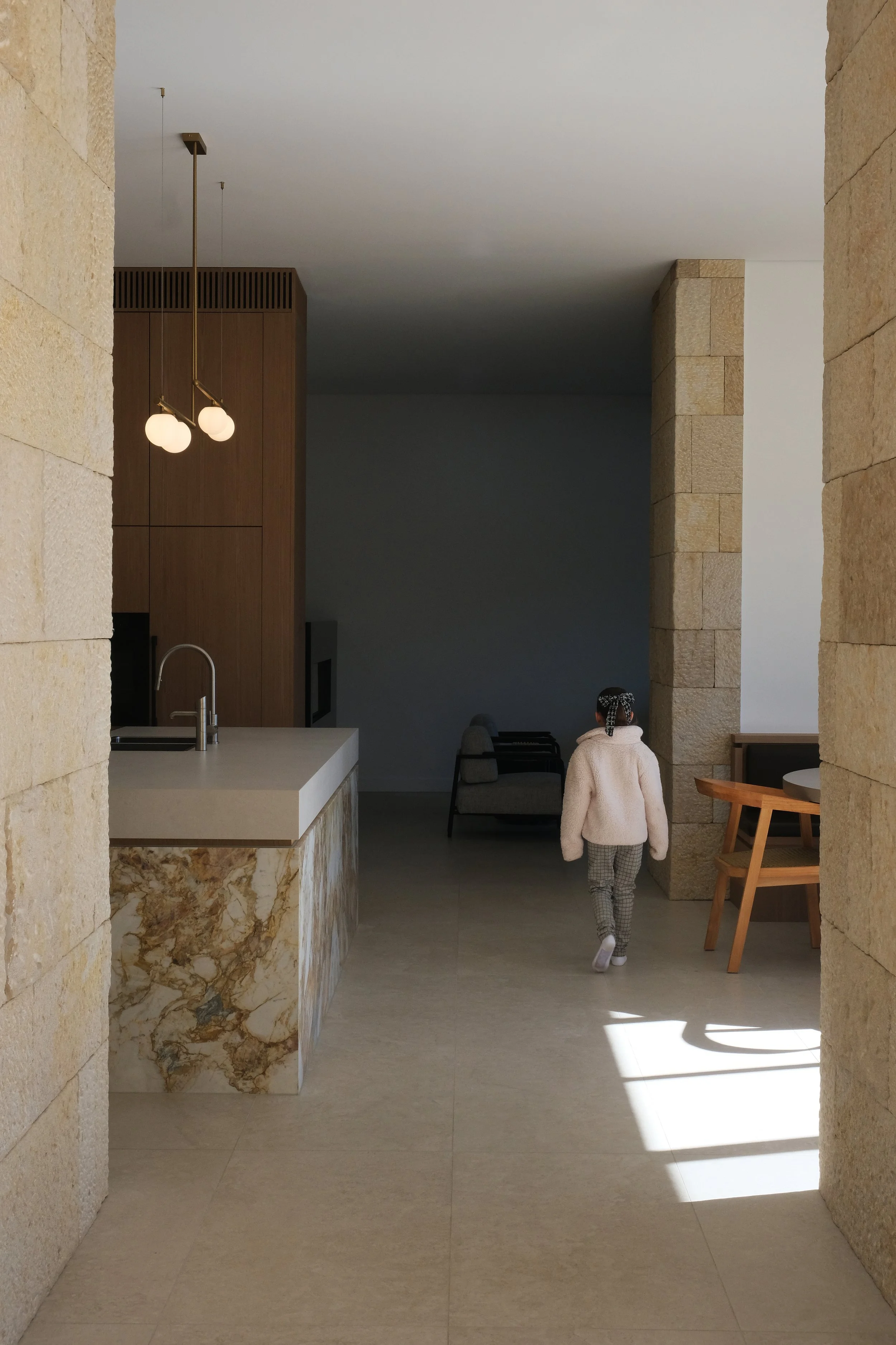 “Natural stone paired with textured wall finishes define the interior renovation of this home. The layering of timeless, authentic materials restores warmth, tactility and vitality into the home’s interior, creating a space that feels both grounded and enduring. ”