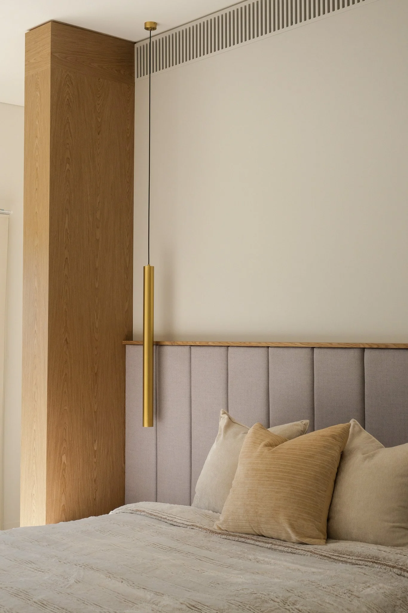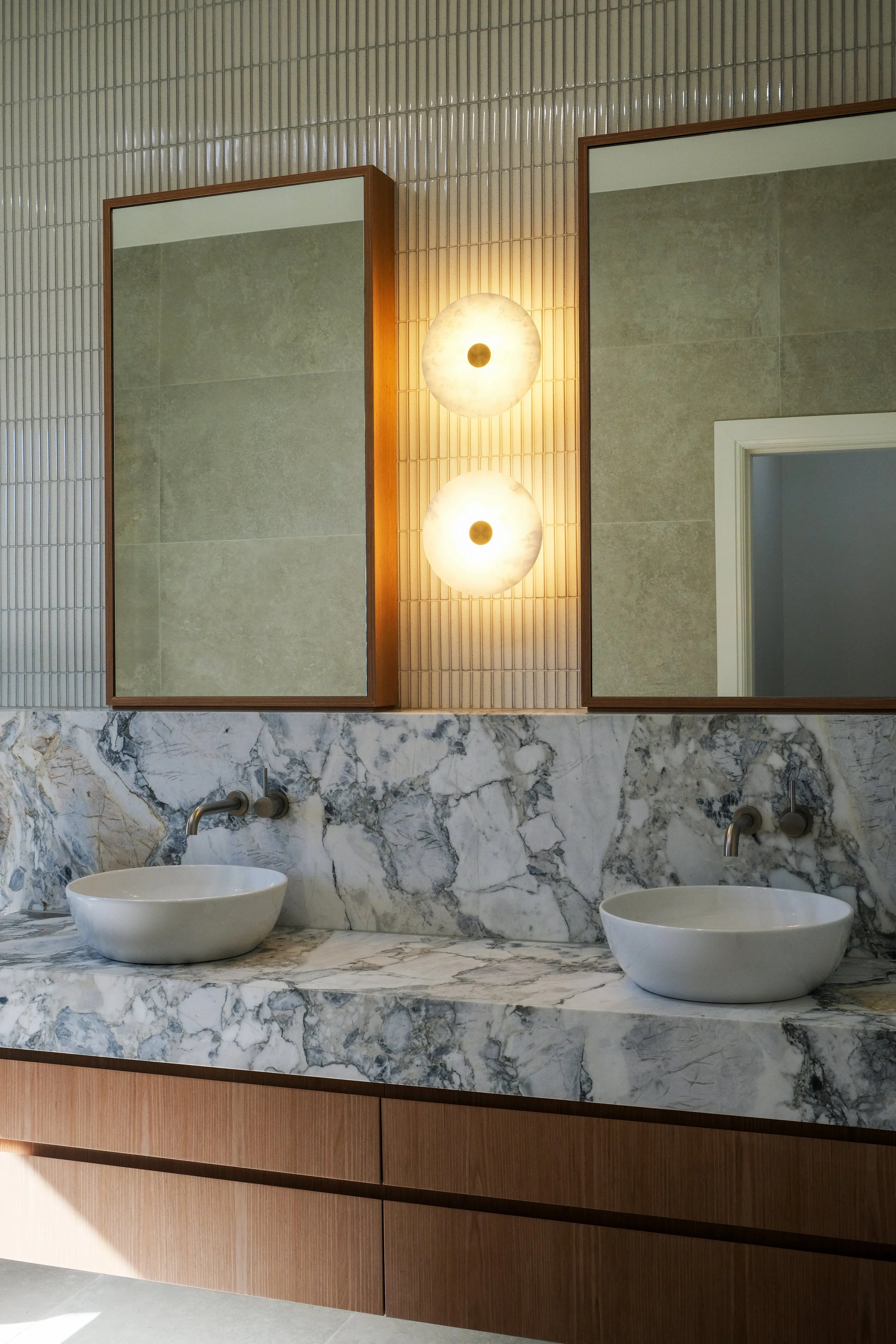 “Grounded by a spectrum of monochromatic greys and warm timber tones; with intention to feel intimate and cocooning, while also being neutral enough to allow for a layer of playful insertions to be incorporated within based on the inhabitant. The combination of natural timber, stone and concrete stone, adds a depth of texture. ”