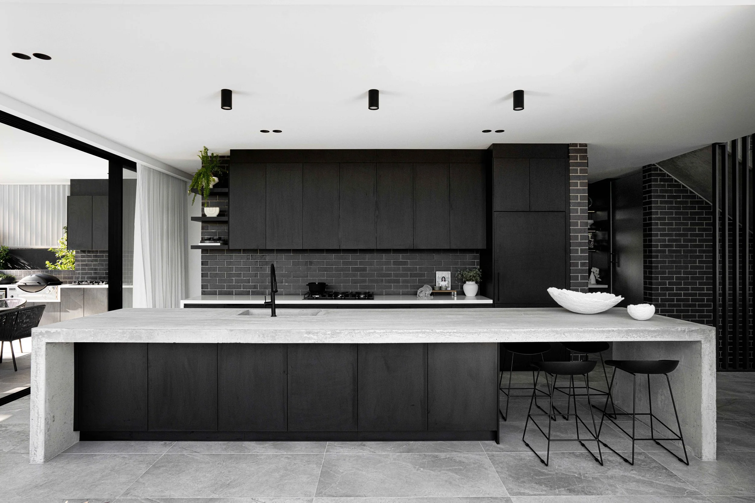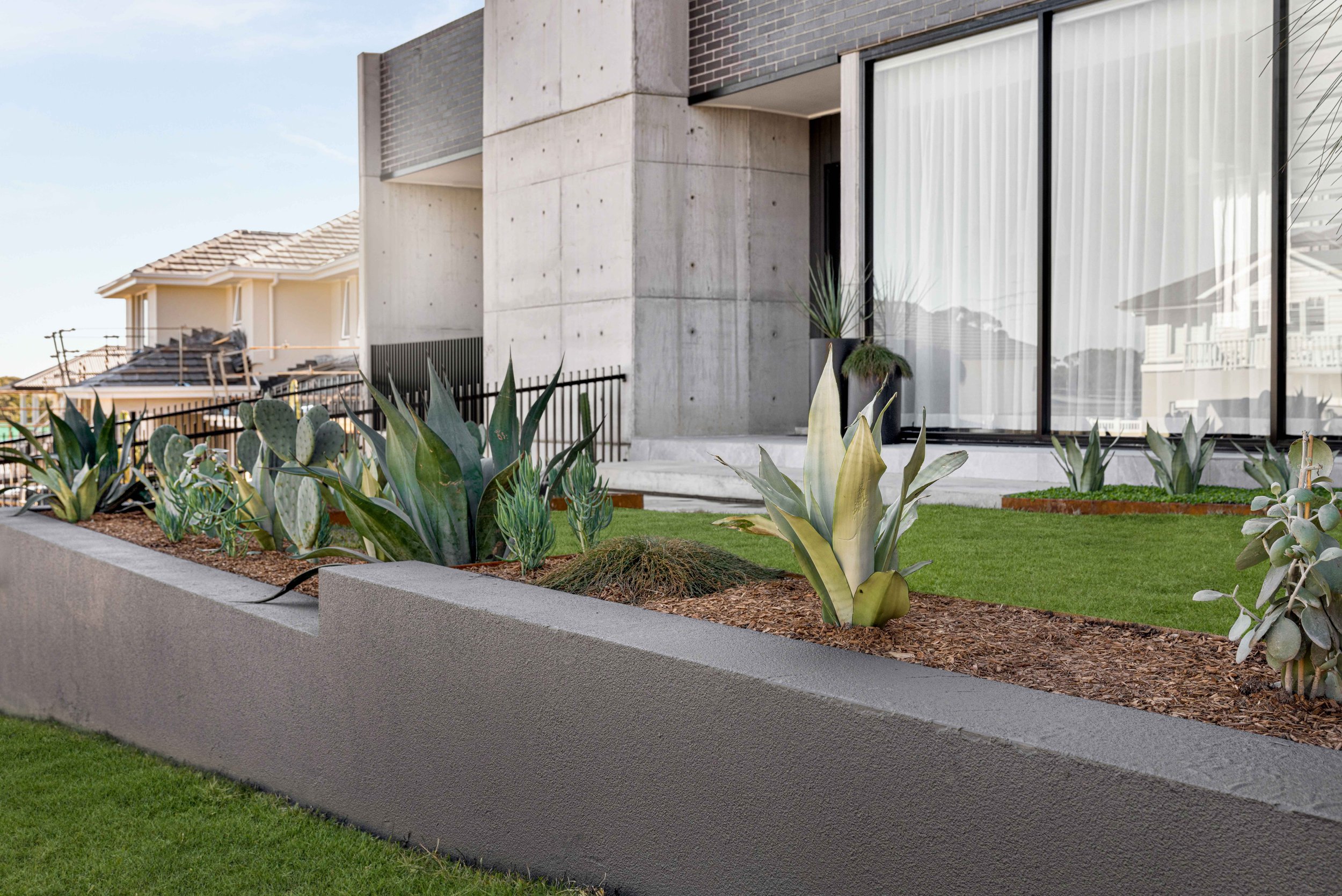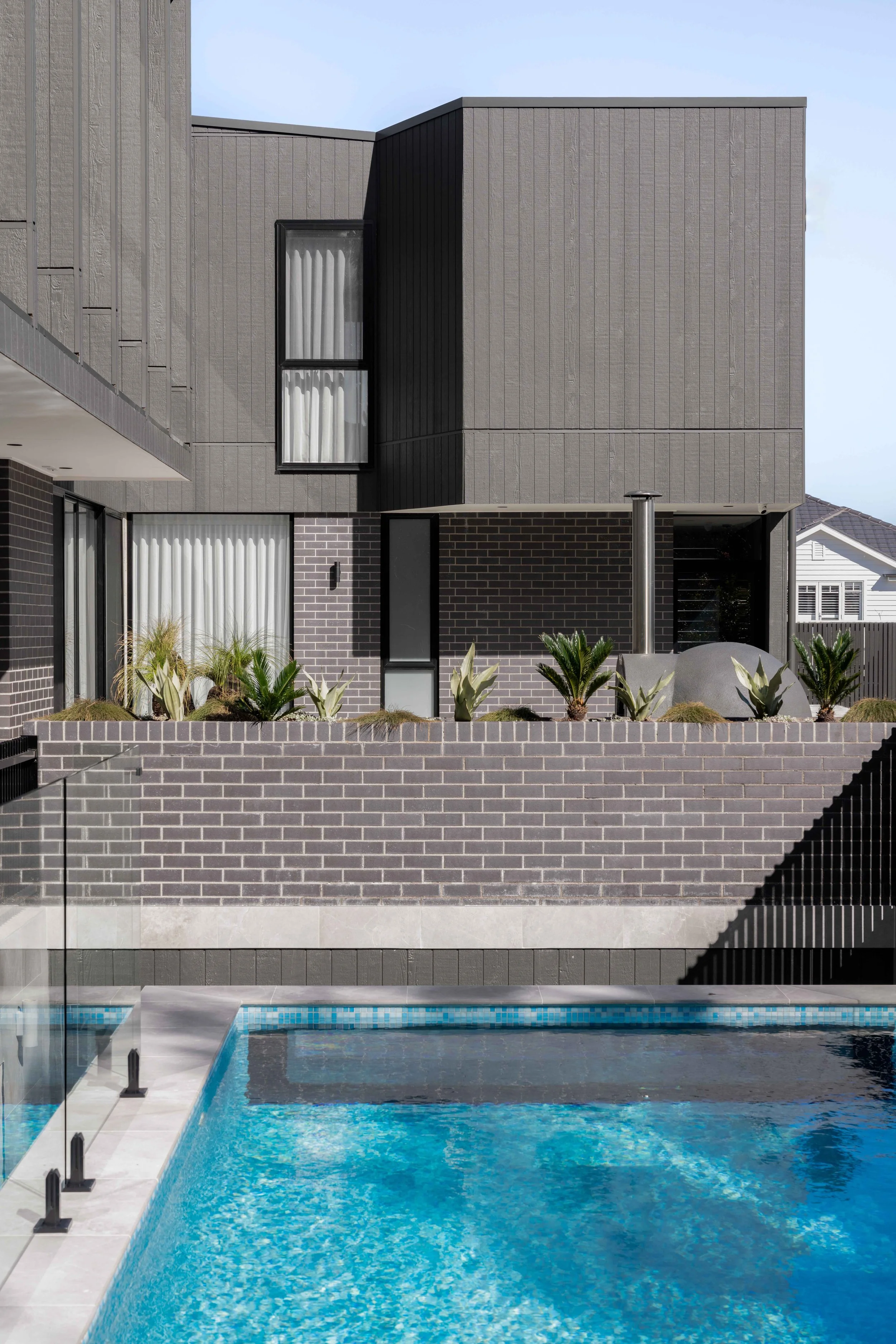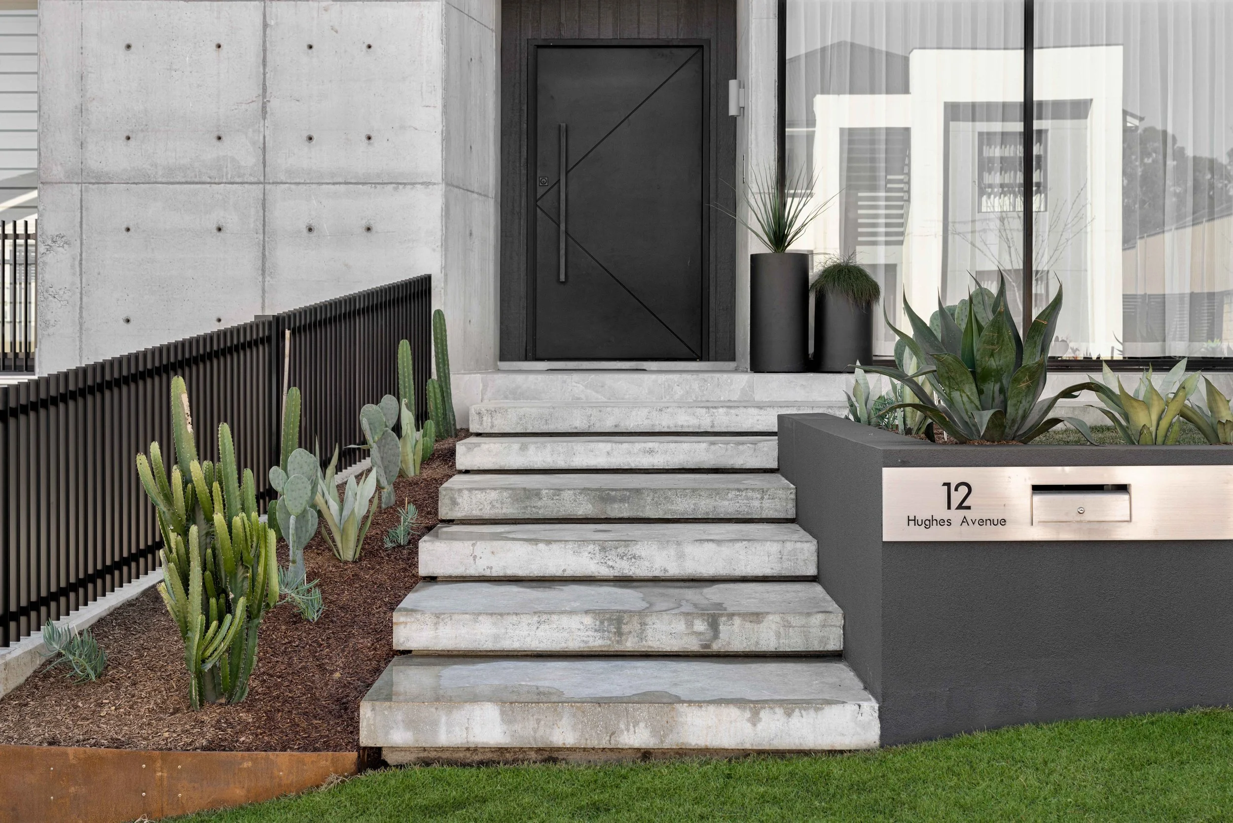 The exterior façade appears as raw, monolithic, geometric and minimalist. Adopting features of the Bauhaus movement, this design poses a smooth façade which is complimented by cubic shapes. Generous outdoor living spaces are defined by the envelope of the home, allowing for spaces to funnel natural light within the open plan living, softening raw materials. This is complimented by open plan living spaces, scaling both volume and openness.